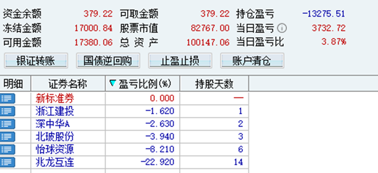开盘10分钟直接暴跌,反应过来小加仓做了个t。但是这种突发情况,应该先空仓离场观望的。国家队大买中字头拒绝暴跌,小票使劲俯冲。等到下午指数再度回落,觉得一天看不出行情,就先卖出再接回做了个t。等待第2天看看情况。全仓亏了6个点。