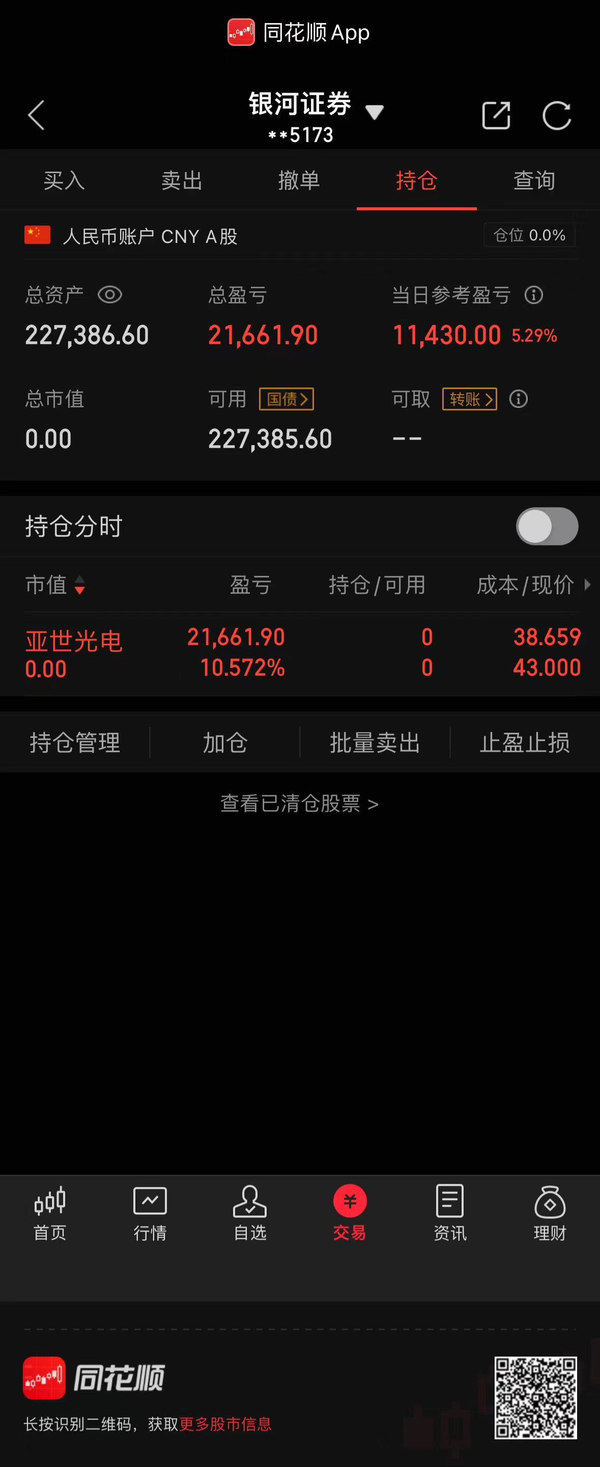 持有亚士的逻辑,就是二波预期,但是3天了并没有资金来拉,个人判断是获利盘较多,筹码并未充分交换,因此没有资金来抬轿,但是可以围绕亚士光电来做低位的标的进行套利,比如可川、力鼎、日久。但是上午出了日久挣扎了一下,其他反馈都很差,而且临近中午有其他的题材想尝试,一旦有新的题材走出来,旧题材是肯定要被抛弃的。因此收盘前出了一半。 午盘指数被杀的超预期了,清源上午就板了,亚士作为一间暂时避难的安全屋,被资金买了起来,这样的大环境,就算是龙头也很难持续,何况亚士并不是龙头,就全部清掉了。